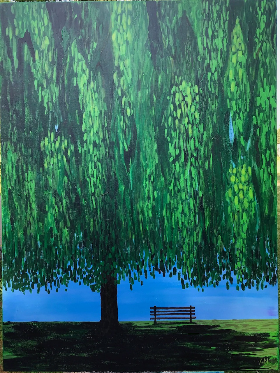 Amanda Noll’s artist statement: My new paintings are large abstract works on canvas. I’ve included a small bench or swing to invite the viewer in. I kept feeling ‘big nature, little us’ as I worked. I hope my paintings make you feel more than you think- if just for a few moments. I’m passionate about the healing capabilities of making and viewing art.