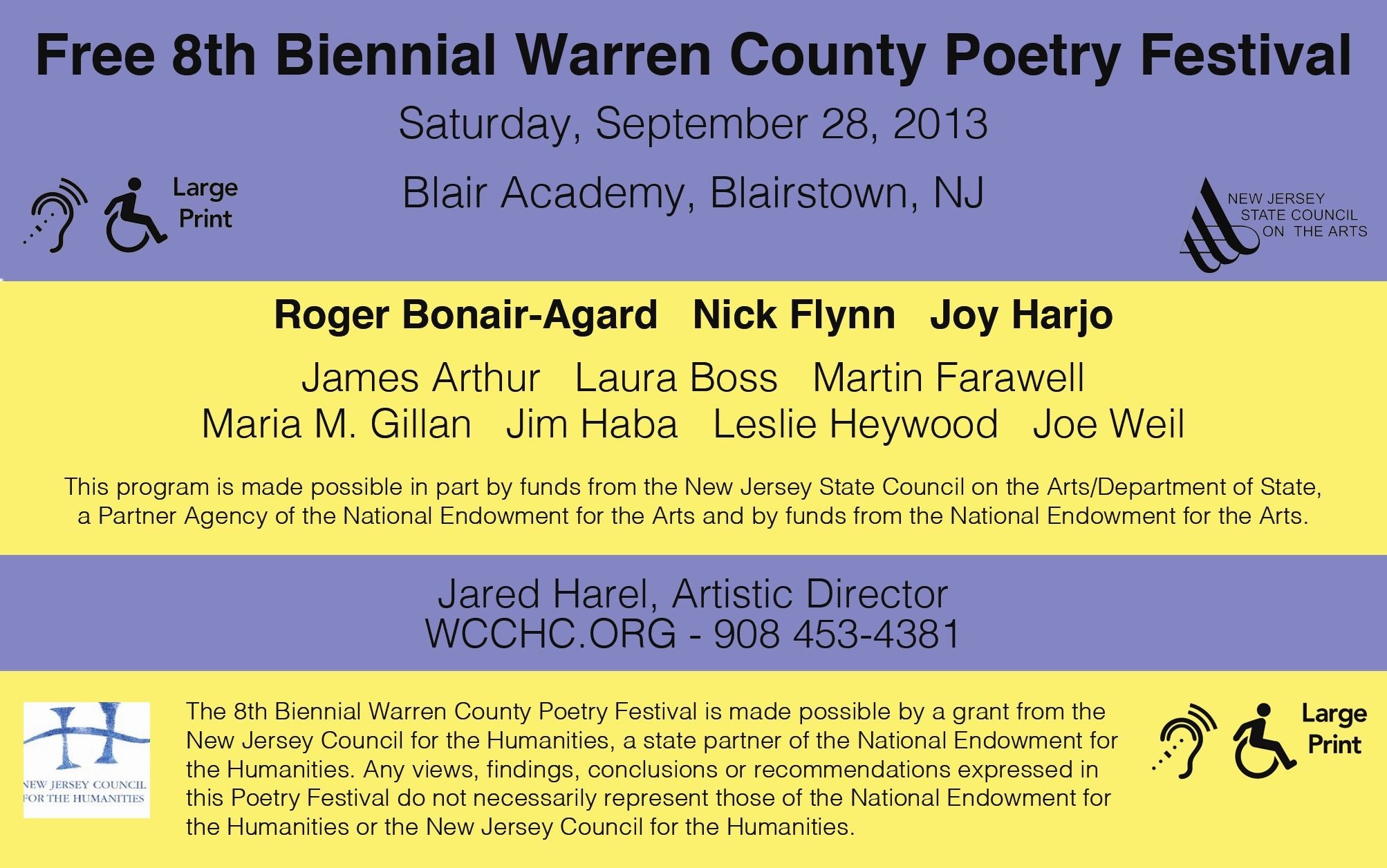 8th Biennial Warren County Poetry Festival Saturday, September 28, 2013 -- 10:30 AM – 7:30 PM Armstrong-Hipkins Center for the Arts at Blair Academy, Blairstown, NJ